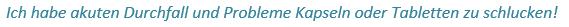Imodium® akut, Imodium® akut lingual, Imodium® akut Softkapsel. Wirkstoff: Loperamidhydrochlorid. Zusammensetzung: Arzneil wirks. Bestandt.: 1 Hartkapsel / Schmelztbl. / Weichkapsel enth. 2 mg Loperamidhydrochlorid. Sonst. Bestandt. Hartkapsel: Lactose-Monohydrat, Maisstärke, Talkum, Magnesiumstearat, Gelatine, Farbstoffe der Kapselhülle (Titandioxid, Indigocarmin, Eisen(III)-hydroxid-oxid, Eisen(II,III)-oxid, Erythrosin). Schmelztabl.: Gelatine, Mannitol, Aspartam, Natriumhydrogencarbonat, Pfefferminz-Aroma (enth. Maltodextrin, Levomenthol). Weichkaps.: Weichkapselfüllung: Propylenglycolmonocaprylat, Propylenglycol, H2O ger. Weichkapselhülle: Gelatine, Propylenglycol, Glycerol, Farbstoff, Phospholipide (Soja), mittelkettige Triglyceride. Anwendungsgebiet: Symptomatische Behandlung akuter Diarrhöen für Jugendliche ab 12 Jahren und Erwachsene, sofern keine kausale Therapie zur Verfügung steht. Eine über 2 Tage hinausgehende Behandl. nur unter ärztl. Verordnung u. Verlaufsbeobachtung. Warnhinweis: Hartkapsel enth. Lactose. Schmelztabl. enth. Aspartam, Levomenthol. Weichkapsel. enth. Phospholipide (Soja). Gegenanzeigen: Allergie gegen Loperamid, einen der sonst. Bestandteile, Schmelztabl. zusätzl. gegen Levomenthol, Weichkapsel. zusätzl. gegen Soja, Erdnuss; Bakterielle Darmentzündung durch in die Darmwand eindringende Erreger, z. B. Salmonellen, Shigellen, Campylobacter; Zustände, bei denen e. Verlangsamung d. Darmtätigkeit wegen mögl. Folgeerscheinungen zu vermeiden ist, wie Ileus, Megacolon, toxisches Megacolon. Sofort absetzen bei Obstipation, aufgetriebenem Leib o. Ileus; Durchfälle mit Fieber und/oder blutigem Stuhl; Durchfälle während od. nach der Einnahme v. Antibiotika (pseudomembranöse [antibiotikaassoziierte] Colitis); Akuter Schub einer Colitis ulcerosa; Absolut: Kinder < 2 Jahren, nicht ohne ärztliche Verordnung: Kinder zwischen 2 u. 12 Jahren, chronische Diarrhö, bestehende od. durchgemachte Lebererkrankung (verlangsamter Abbau mögl.). Nicht empfohlen in d. Stillzeit. Schwangerschaft: Strenge Indikationsstellung. Nebenwirkungen: Häufig: Kopfschmerzen, Schwindel; Obstipation, Übelkeit, Flatulenz. Gelegentlich: Schläfrigkeit; Abdominelle Schmerzen und Beschwerden, Mundtrockenheit; Schmerzen im oberen Abdominaltrakt, Erbrechen; Dyspepsie; Hautauschlag. Selten: Überempfindlichkeitsreaktionen, anaphylaktische Reaktionen (einschließlich anaphylaktischem Schock), anaphylaktoide Reaktionen; Bewusstlosigkeit, Stupor, Bewusstseinstrübung, erhöhter Muskeltonus Koordinationsstörungen; Miosis; aufgeblähter Bauch; Ileus (einschließl. paralytischem Ileus), Megacolon (einschließl. toxischem Megacolon); Bullöse Reaktionen (einschließlich Stevens-Johnson Syndrom, toxisch epidermale Nekrolyse, Erythema multiforme), Angioödem, Urticaria, Pruritus; Harnretention; Müdigkeit; Schmelztabletten zusätzlich Glossodynie.