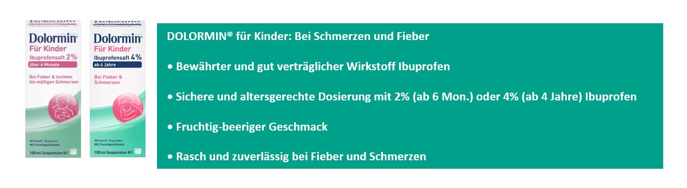 DOLORMIN® für Kinder mit Ibuprofen ist zur Behandlung von Fieber und Schmerzen bei Kindern ab 6 Monaten geeignet. Der Wirkstoff Ibuprofen wird als fruchtig-beerig schmeckender Saft angeboten. Im Gegensatz zu Tabletten oder Zäpfchen lässt er sich je nach Alter und Gewicht des Kindes mittels eines Messbechers exakt dosieren.
