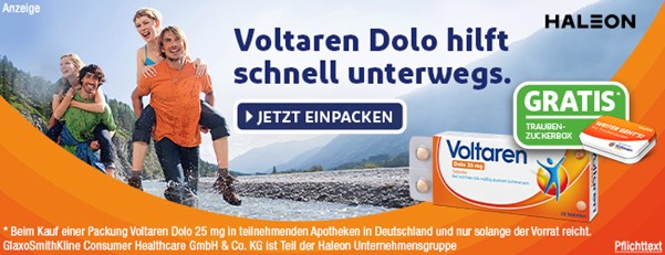 Pflichttext: Voltaren® Dolo Liquid 25 mg Weichkapsel Wirkstoff: Diclofenac-Kalium. Anwendungsgebiete: Zur symptomatischen Behandlung von leichten bis mäßig starken Schmerzen; Fieber. Warnhinweis: Enthält Sorbitol. Apothekenpflichtig. Stand: 09/2017. Zu Risiken und Nebenwirkungen lesen Sie die Packungsbeilage und fragen Sie Ihre Ärztin, Ihren Arzt oder in Ihrer Apotheke.